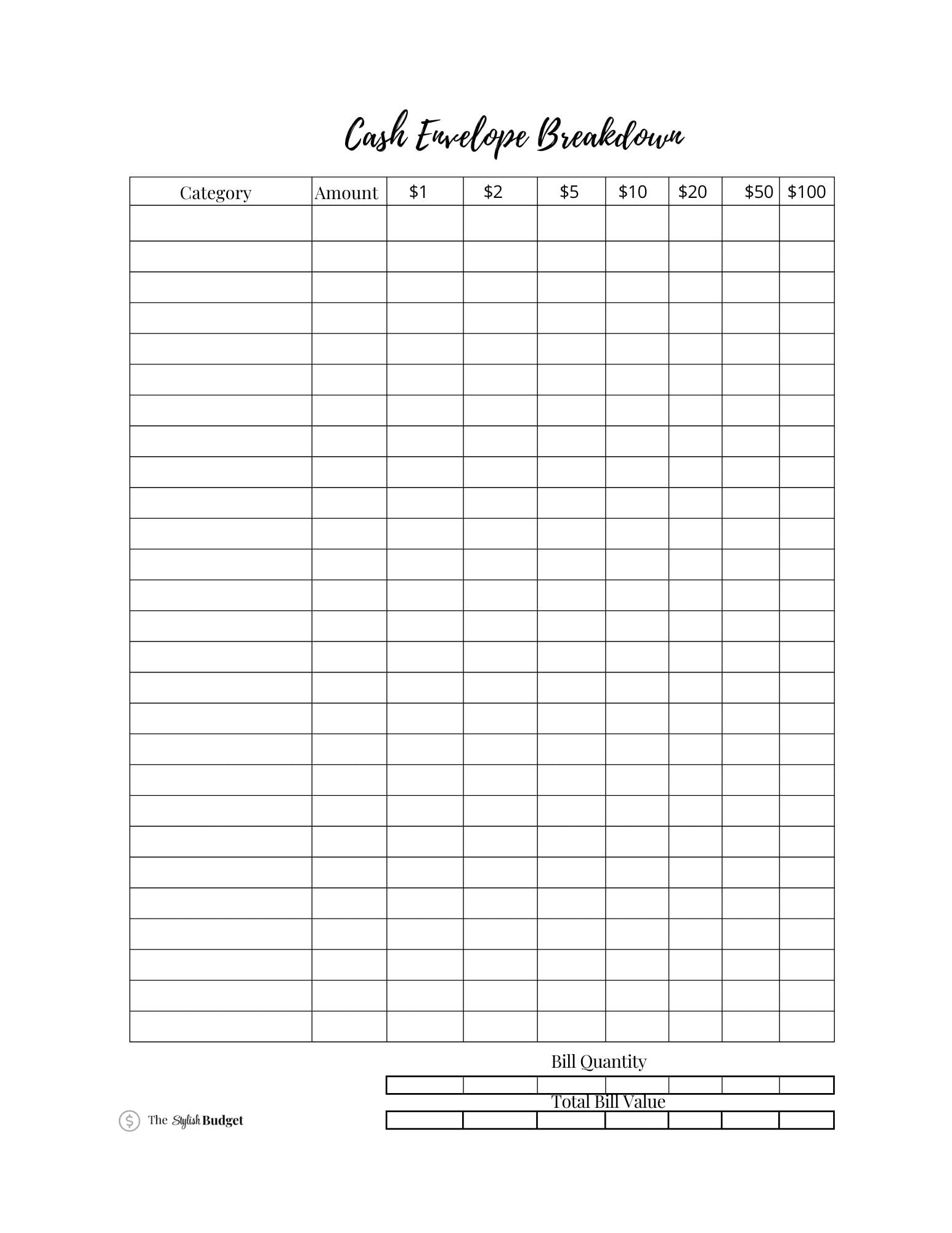 Cash Envelope Breakdown Sheet - Printable Budgeting Insert - Bill Denomination Tracker for Cash Stuffing